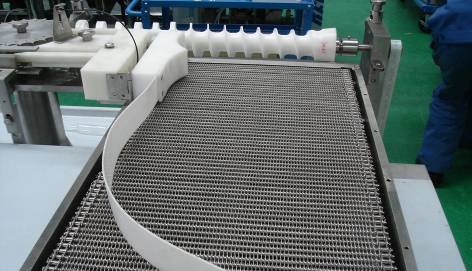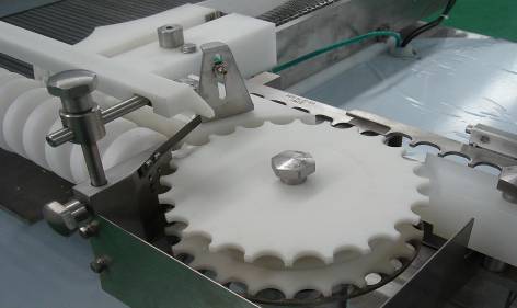 3.2 进瓶网带采用带链条的不锈钢网带(间距为9.8mm),通过链轮进行传输,避免了由于底带跑偏或爬行引起的掉瓶、碎瓶与倒瓶现象,其输瓶平衡。网带采用变频器进行调速控制,有利于与主机的速度匹配、协调一致。在进瓶处装有弹簧与弹片缓冲装置,同时设有进瓶自动控制装置,挤瓶时能自动指令清洗机暂停进瓶,缺瓶时自动切断绞龙进瓶,设备停止工作,在出现故障时,设备自动停机。(见图二)