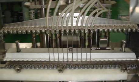 位设有自动校直装置,解决了因瓶子质量而造成产品合格率不高问题,避免了药液在封口时出现焦头现象。灌装针头采用单独装夹技术,并且每只灌装针头均可独立上下左右进行调整,这样有利于灌装针头位置的单独调整。(见图七)