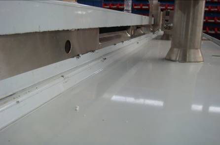 3.15 采用外观专利技术,台面板无接缝,与机件连接处无卫生死角。拉丝和灌装部件上部无导向装置,既减少了台面以上的运动摩擦副,又避免了油污污染。机架采用整体焊接方式,使用刚性更好,机器的稳定性更佳。台面采用阶梯式,并且安装在台板上的物件少,便于清洗与维护。(见图十四