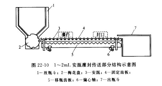 1一2ml-安瓿灌封机传送部分如图22—10所示。洗净灭菌的安瓿由人工放人与水平成45。倾角的放料斗上,料斗下梅花盘由链条带动,每转1/3