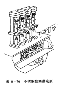 灌注部分结构如图22—11所示。整个灌注部分可分三个部件。 (1)凸轮—拉杆部件 将药液从贮液瓶中吸人注射器,并推人安瓿内。 (2)