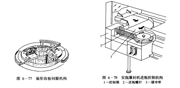 (4)扇形齿板靠2个槽凸轮的叠加作用,伺服于进瓶螺杆和输送齿条,能使交接平稳,速度快,噪声低,而且利于排除碎瓶玻璃屑,如图6—77所示。