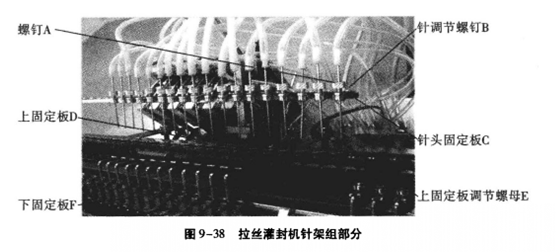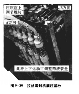 针架组的针头组的调节:针头组包括吹气组和灌装药液组。两组调节方法相同,特别是药液灌装,可以有针调节螺钉(B)调整松动,移动针头固定板(c),然后对准安瓿中心旋紧螺钉(B);接着调整整体行程到瓶颈部位,再调整螺钉(A)使针管微量上下移动至超过瓶颈2 mm处(图9—38),则使针头进入安瓿时不与安瓿口摩擦;转动手轮,针头架的针头向下移动的时机应该使安瓿刚刚搁到灌注药液(同吹气)这档齿板时,针头应开始插入安瓿口,当药液灌注好后,针口应在安瓿搬动前全部退至安瓿口外,一个一个针头调整,直到两组针头全部调整好为止。必须再用手轮多转几圈,查看机构工作情况。注意每只松动的紧固螺钉一定要在调整后旋紧。