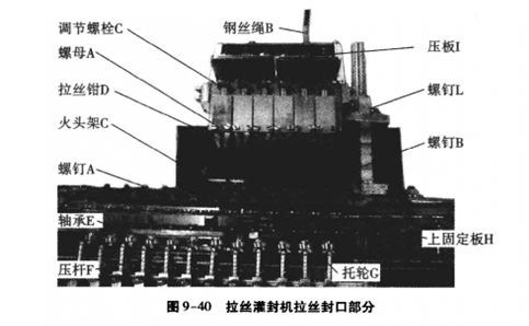 拉丝钳的调节:首先,调整压杆F使其上轴承E压在安瓿上旋转自如,同时托轮G及上固定板H使安瓿垂直于底板,保证旋转平稳。再旋转螺钉L对拉丝钳D进行粗调,使拉丝钳钳VI到达安瓿拉丝部位,观察拉丝f青况,然后对微调螺母A进行微调,修正钳VI位置,使拉丝钳拉丝达到技术要求。最后,调节螺栓c可微调钳口开合大小。前凸轮转动,使钢丝绳B上下运动,压板I上下摆动,从而使拉丝钳口D开闭。